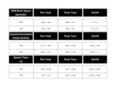 Tables 1 and 2 below show the difference in performance improvement for all measurables. One point of emphasis is the improvements seen in linear sprints. This study used a 10m fly with a 5m lead in to measure sprint times. Both groups experienced statistically significant growth, but neither group out-performed the others in pre-post test growth. The point here is that the differences did not rise to statistical significance for academia, however, practically speaking the VBT group did experience marginally better improvement averaging 0.01 greater sprint time reduction over the PBT group. As a coach, a method producing a 0.01 greater improvement to 10m fly times in 6 weeks is a method I would consider adopting.