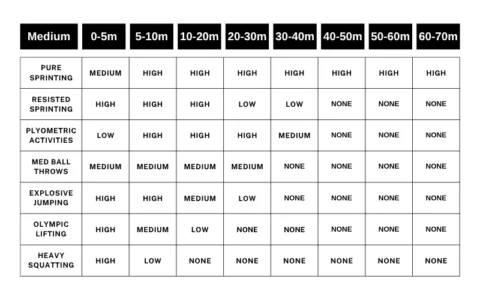 Chart: Derived from Vernali’s Chart of Modalities that shows as sprint distance increases, transfer from traditional exercises diminishes. Chart sourced from Science for Sport. (2013, June 10). Kinetics manual [PDF]. Science for Sport. https://www.scienceforsport.com/wp-content/uploads/2018/09/Kinetics-Manual.pdf?srsltid=AfmBOorgPQxpEuG9X5HbfAphhSab9F8k2CoJfS8JAunQqYEy9eZDrHbN