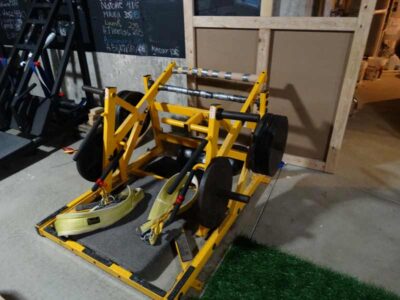 Venía con una barra instalada para poner el pie trasero, y todo lo que teníamos que hacer era agarrar y sostener durante los 30 segundos asignados. El problema era que la fuerza de agarre se convirtió en el factor limitante. Añadimos correas (straps), pero eso no funcionó. Probamos una variedad de cinturones, lo cual estuvo bien para algunas personas. Pero gracias a las correas de Iron Mind y los cinturones de sentadilla Spud, armamos un sistema que es muy efectivo porque el peso va a la parte inferior del cuerpo y no está limitado por la fuerza de la parte superior del cuerpo.