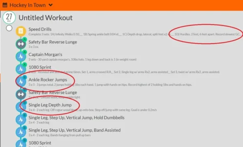 OVR Jump puts a tool in a coaches hand that allows them to easily program exercises along the spectrum of the Force-Velocity Curve. Looking below, here is an offseason workout copied and pasted from TeamBuildr. I have highlighted where and how OVR Jump was used on this day: